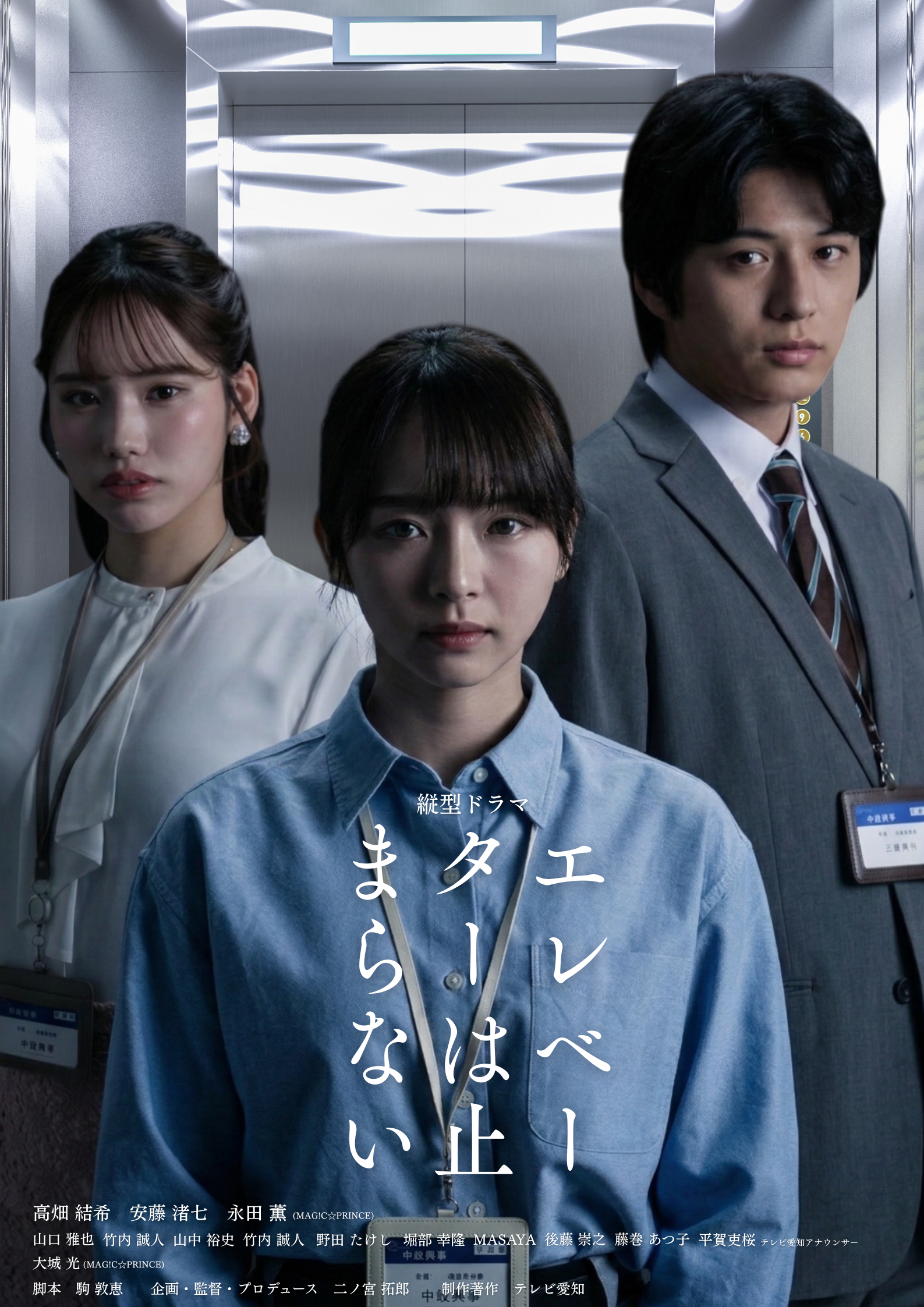 タイトル:縦型ドラマ「エレベーターは止まらない」放送局:テレビ愛知放送日時:3月29日(日)深夜24時50分~25時20分 予定放送エリア:名古屋ローカル配信:TVer、ロキポ(名古屋の民放テレビ局5局が運営する動画配信プラットフォーム)※SNSでもショートドラマとして後日配信出演者:高畑結希(朝倉美咲役)、安藤渚七(黒川玲奈役)、永田薫 MAG!C☆PRINCE(三浦亮介役)